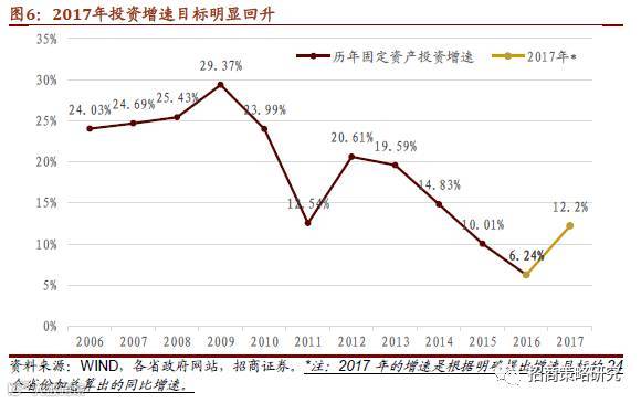 各省两会均召开,各省均提出了各自的投资增速目标,我们根据各省加总计算,2017年投资增速目标明显回升。