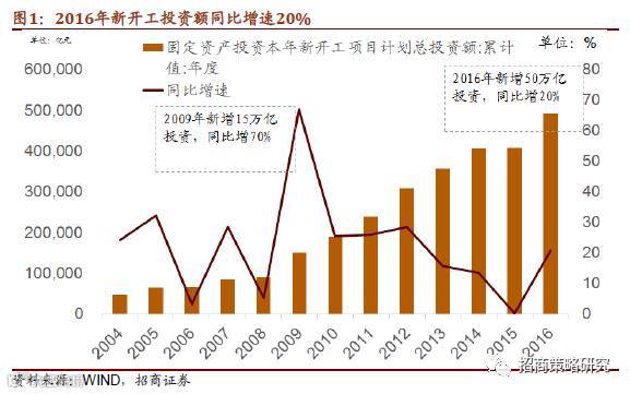 2016年,新计划开工投资额累计近50万亿,同比增速20%,增量近10万亿。