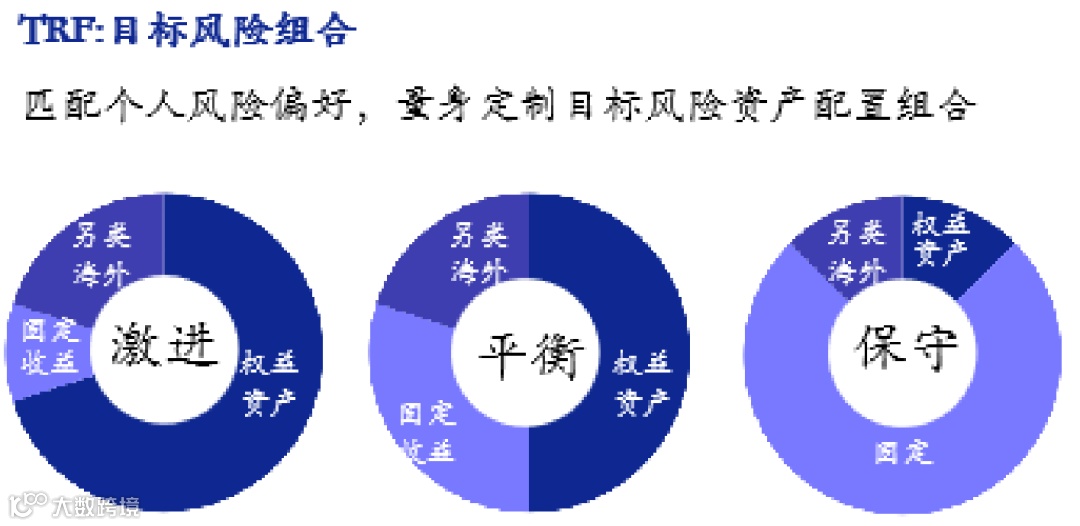 养老目标风险基金,会根据特定的风险偏好水平(如波动率/在险值(VaR)/预期损失)进行资产配置,以匹配不同风险偏好的投资者。其投资逻辑简单直接,目标就是在不同时间上保持资产组合的风险恒定。根据风险等级不同,目标风险基金通常可分为激进型、稳健型和保守型等。风险水平越高的养老目标基金,配置在权益类资产的比例越高。