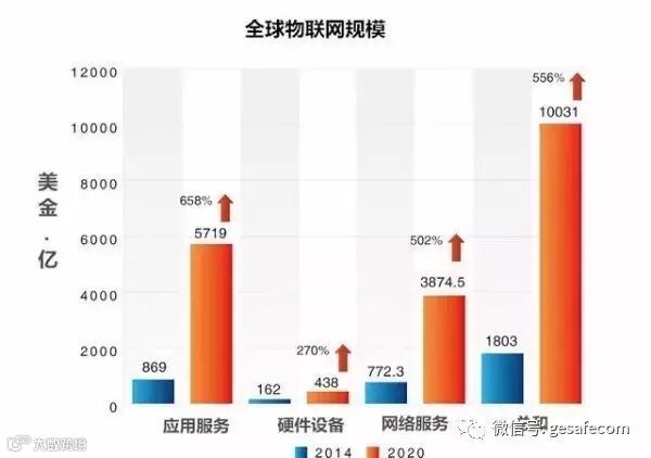 图四是2020年全球物联网规模的预估产值,预计在2020年全球物联网的规模将成长到1兆美金,而应用服务的成长在整体物联网规模的市值中是最明显的,高达6.5倍的成长,从这样的数据也透露,市场对于物联网得应用将会更加多元,且带给用户的附加价值也随之提升。