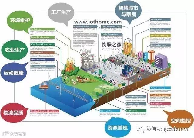 从图三显示,物联网遍及交通、环境保护、政府工作、公共安全、家居安全、消防、工业监测、老人护理、个人健康等多个领域。