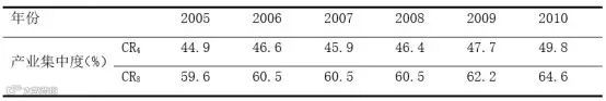 美国工业化中后期煤炭产业发展:余永洲等(2012)将企业的煤炭总产量作为绝对集中度的统计指标,用该办法测算了我国2001-2010年10年间的CR4 和CR8数值,结果显示我国煤炭产业集中度在这10年来处于逐年递增态势,2007年后基本处于平台期,变化不明显,但相对于同期其他发达国家的该项数据,仍有较大差异。从2005年到2010年美国的CR4和CR8数值(表2)可以看出,美国前四家煤炭企业的市场份额基本达到总分和的一半左右,前八家企业占到了市场份额的六成,并且在逐年增加。