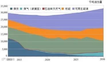 在英国能源转型的不同历史阶段,替代能源供给与产业政策分别起到了促进的作用,其中比较重要的包括北海石油天然气等替代能源大规模开发利用、产业结构由工业向服务业的转变、撒切尔主义供给侧改革坚定不移的“去国有化”进程、天气原因促进的英国社会能源转型自觉性及规划引导的不断提高。目前英国能源消费结构一次能源消费仍以化石能源为主,其中石油和天然气消费占比均为34.4%,煤炭消费占比为16.6%。能源结构的变化主要是体现在煤炭使用量的变化,1970年英国消耗煤炭约5700万吨油当量,到了2014年降至不到300万吨当量,煤炭使用量下降带来的能源缺口被快速增长的天然气所取代。
