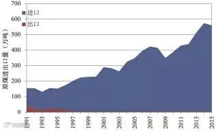 由于德国自身能源匮乏,对进口能源的依赖程度很大,严峻的能源形势迫使德国最早施行了高碳向低碳能源机构的转型,在替代能源领域的成绩处于领先地位。德国政府将于2018年终止对煤炭工业的补贴,势必会影响德国国内企业的生产,并充分利用国际市场供给进行调节。德国从1990年开始出口煤炭量仅有进口量的10-30%开始,在过去的几十年仍然在迅速压缩出口量,同时伴随着进口量的逐年提升(图3)。1990年进口总量1千5百万吨左右,2008年超过4千5百万吨,到2013年进口总量超过5千万吨。同时德国在新能源方向的进展对缓解进口需求提供支持,2016年前三季度德国煤炭进口量就相比去年同期减少1千5百万吨左右。