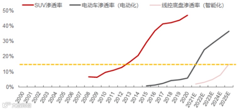 (数据来源:Wind, 民生证券研究所预测(类似 2011 年 SUV 渗透率至 10%左右后驱动汽车行业第二产能周期开启,预计 2022 年电动车渗透率将到20%左右);资料参考:民生证券《汽车的革命系列报告之一:电动智能黄金十年已来,供应链升级重构长牛开启》,2022.2.14)