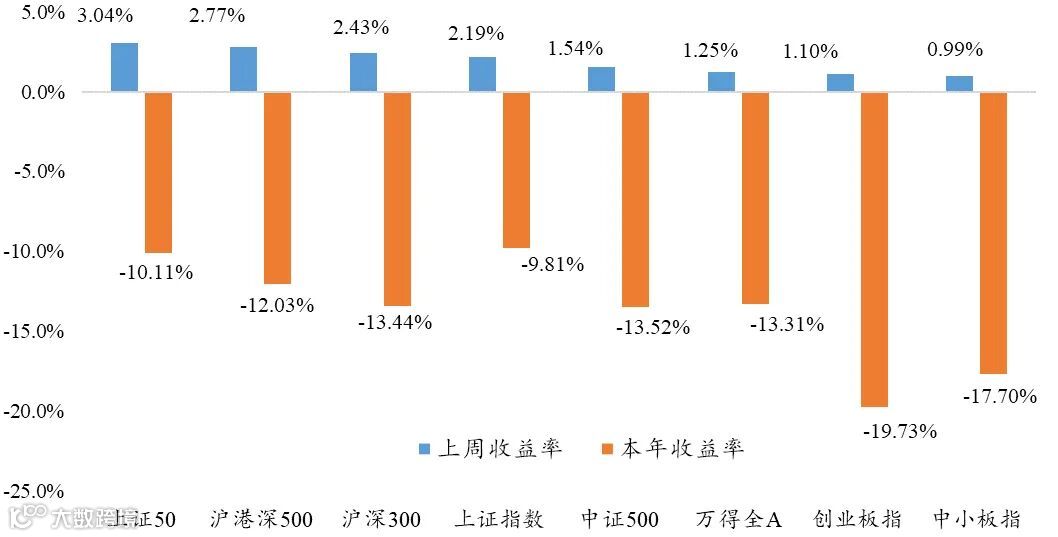 上周市场各宽基指数上涨。万得全A上涨1.25%,沪深300上涨2.43%,创业板指上涨1.10%。