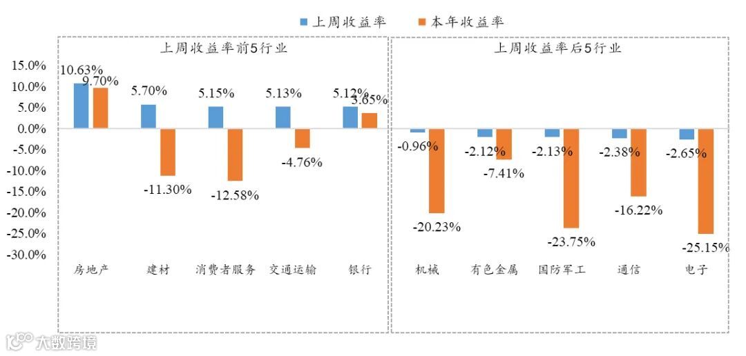 上周收益率居前的行业为房地产、建材、消费者服务、交通运输、银行,上周收益率分别为10.63%、5.70%、5.15%、5.13%、5.12%。电子、通信、国防军工、有色金属、机械为上周收益排名靠后的行业。