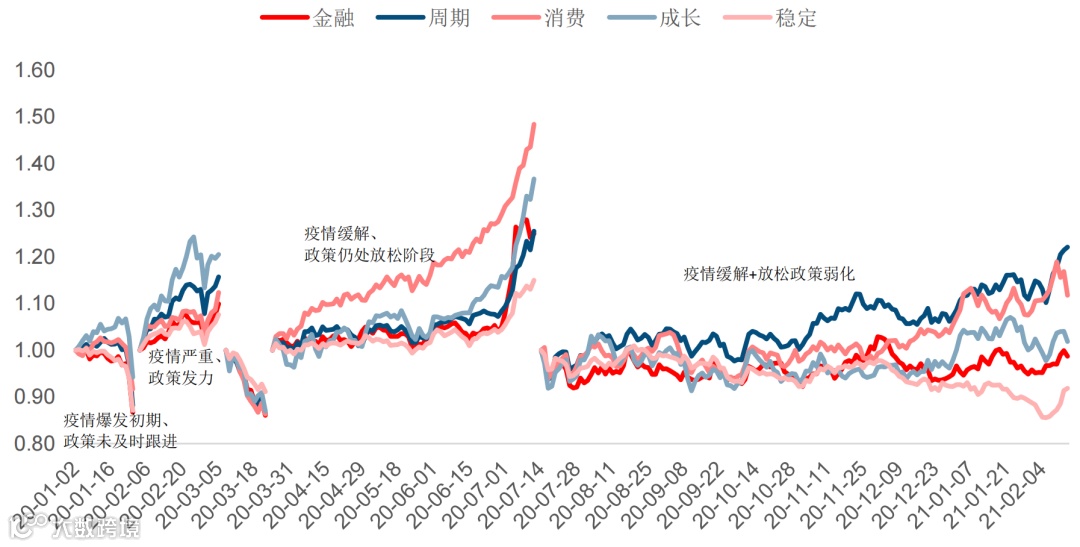 风格轮动是市场的普遍现象,比如,Wind和中信建投研报数据显示,回顾2020年1月2日至2021年2月26日这段时间,随着政策和疫情组合节奏的变化,其背后展现出的行业轮动规律如下图所示:成长、消费、周期、金融、稳定,在不同时段有不同表现。