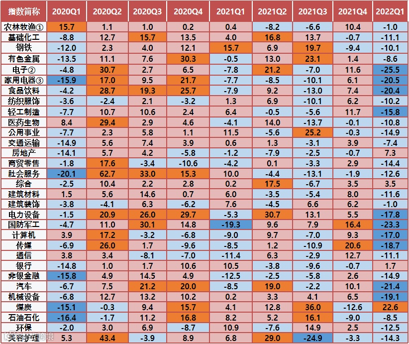 再比如,根据Wind数据,电子行业②在2020年第四季度至2022年第一季度,持续呈现“涨跌交替”,连续6个季度涨幅分别为+6.5%、-7.8%、+21.2%、-7.0%、+11.6%、-25.5%;家用电器③行业则在2020年第二季度至第四季度,录得了连续三个季度的上涨,此后又在2021年第一季度至第三季度,录得了连续三个季度的下跌。