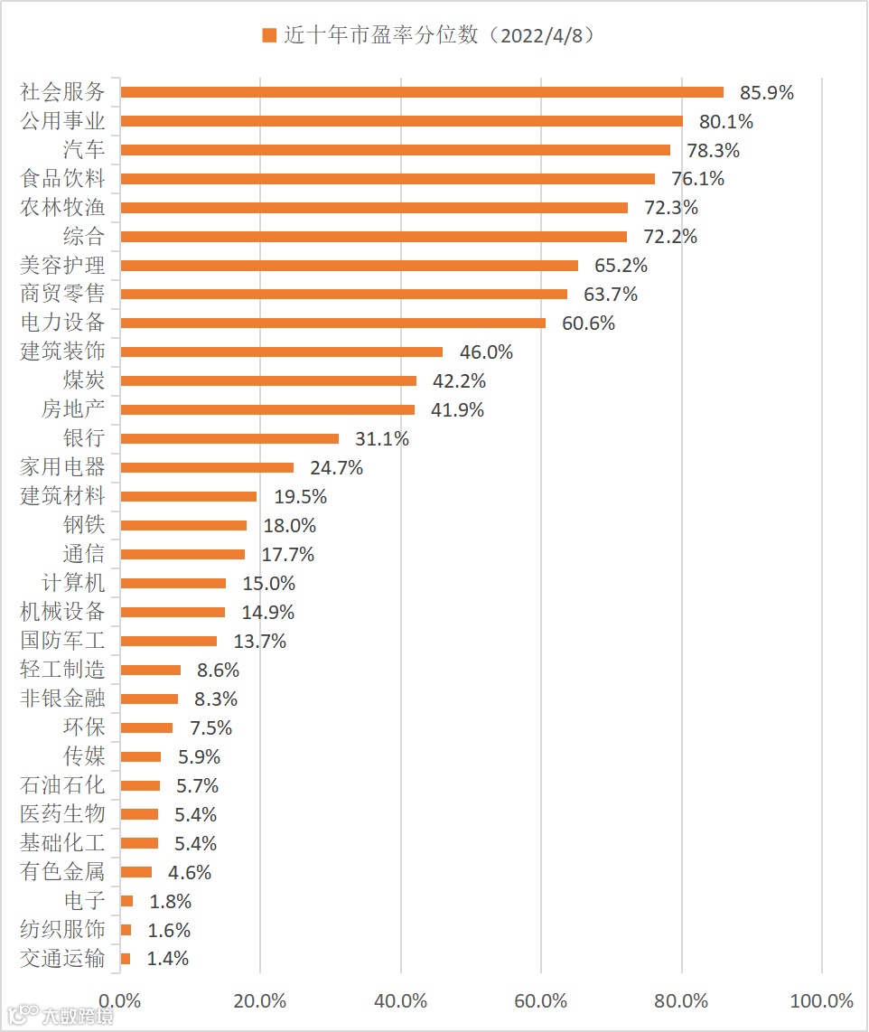 申万一级行业最新市盈率分位数(近十年)