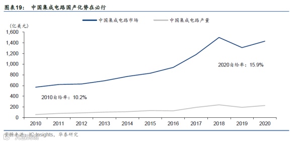 随着数字经济在全国GDP比重的提高,芯片在各个经济部门的渗透率也不断提升,发展半导体产业关乎我国经济安全。据IC Insights数据,2020年中国的集成电路的产量占国内1434亿美元集成电路市场的15.9%,高于2010年的10.2%,但占比仍然比较小。据IC Insights预测,到2025年,中国制造的集成电路制造将占国内整体集成电路市场的19.4%,预计至2030年该比例有望提升至30%。