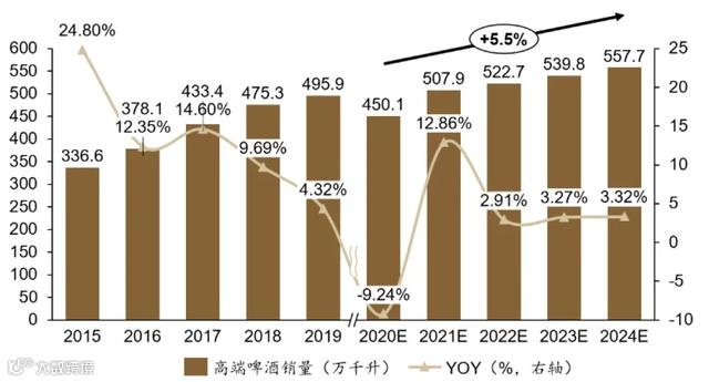 预计未来五年高端啤酒销量GAGR 5.5%