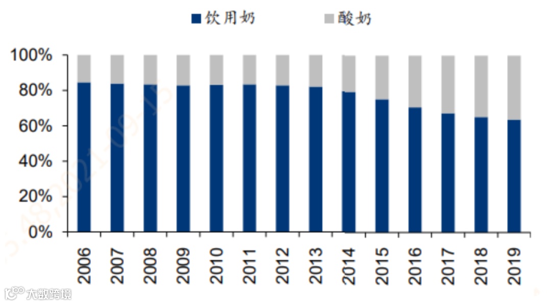 2006-2019年液态奶中分产品零售额份额情况