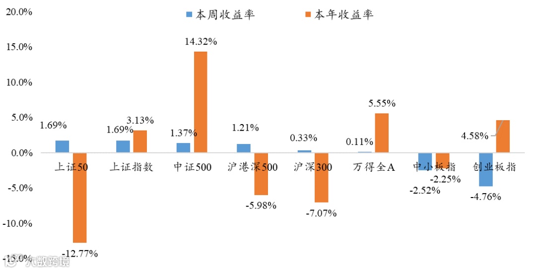 本周市场呈现上涨走势,上涨50涨幅最高。万得全A上涨0.11%,沪深300上涨0.33%,创业板指下跌4.76%。