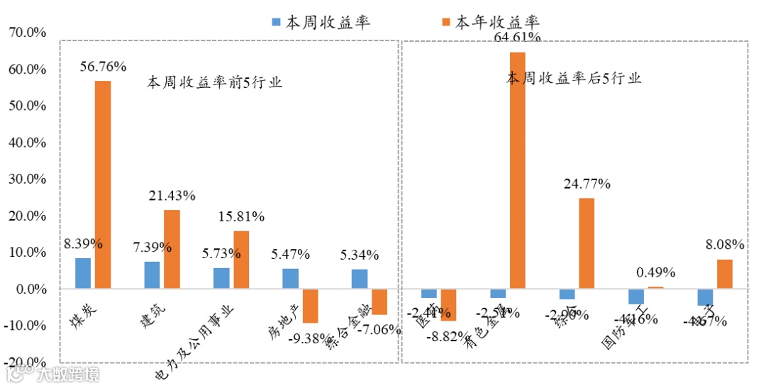 本周涨幅居前的行业为煤炭、建筑、电力及公用事业、房地产、综合金融,本周收益率分别达8.39%、7.39%、5.73%、5.47%、5.34%,其中煤炭行业今年以来收益较为可观,达到56.76%。电子、国防军工、综合、有色金属、医药为本周收益排名靠后的行业。