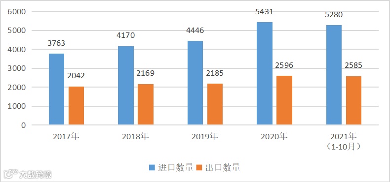 (数据来源:海关总署;2021年数据截至10月份;单位:亿个)