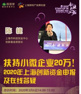 特邀上海市科技创业中心 陈捷部长,举办了一场关于2020年“创业在上海”扶持小微企业20万,上海创新资金申报及在线答疑的网络直播培训。
