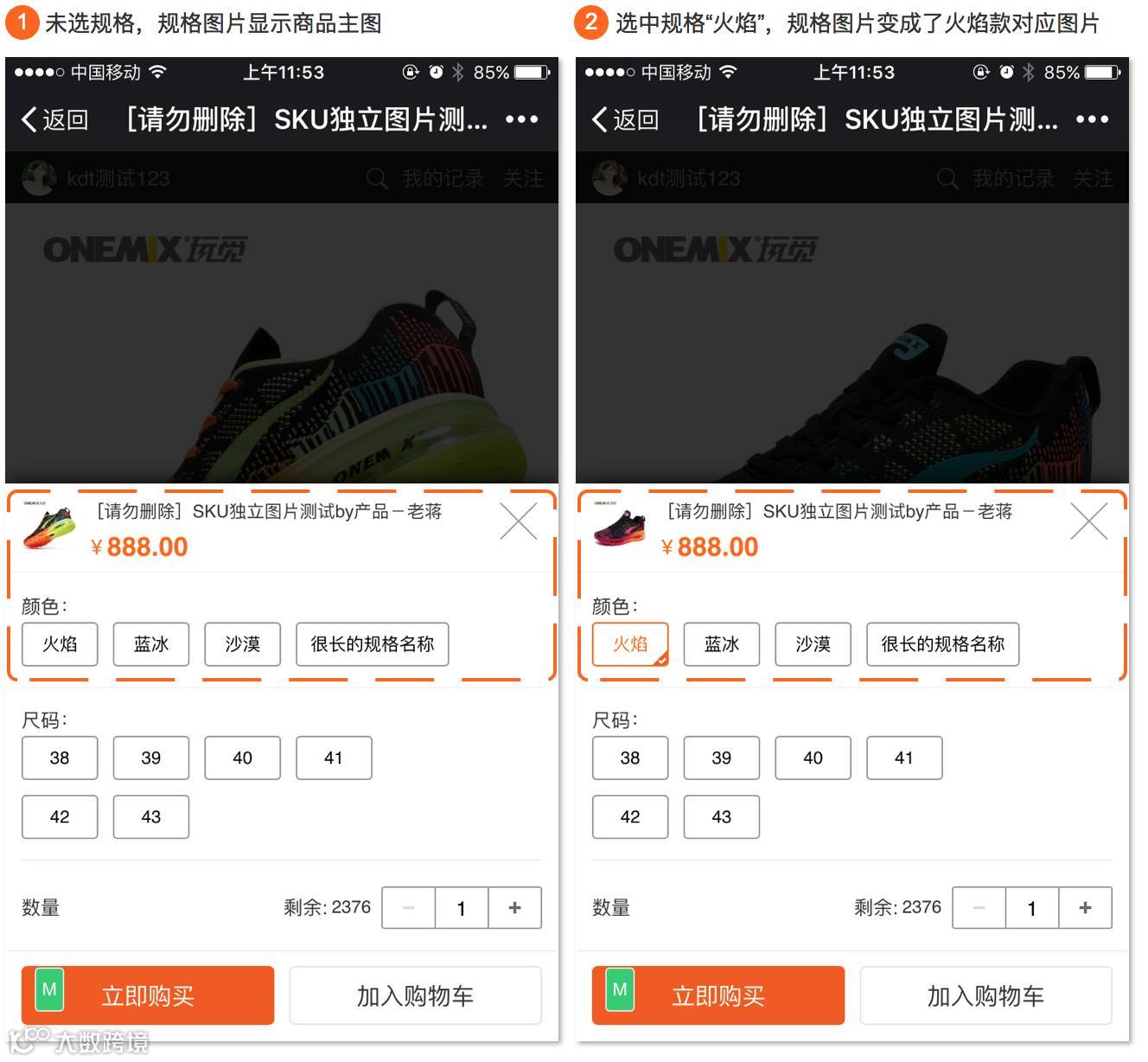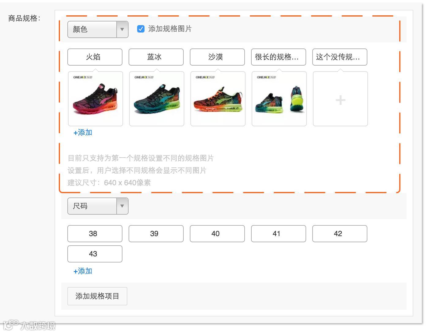 商品规格可以加对应规格图片,勾选添加规格图片,目前仅第一组规格支持规格图片