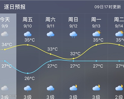 09日12时~10日08时:今天下午到夜里,多云转阴,西北风2级,气温34~26℃