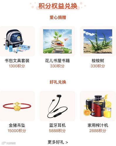 通过打卡、阅读获得积分后,积分可奉献爱心,为贫困地区儿童捐赠所需的学习用品或沙漠地区种植梭梭树苗,为公益事业贡献一份力量。当然,也可以兑换手机话费、家用榨汁机、金猪吊坠等丰厚实物奖品!