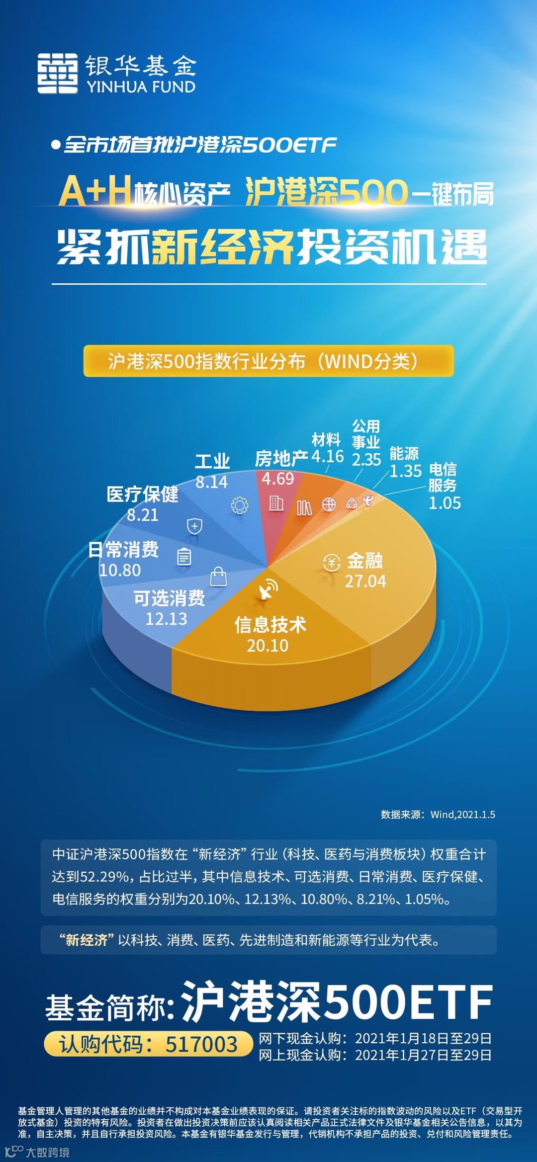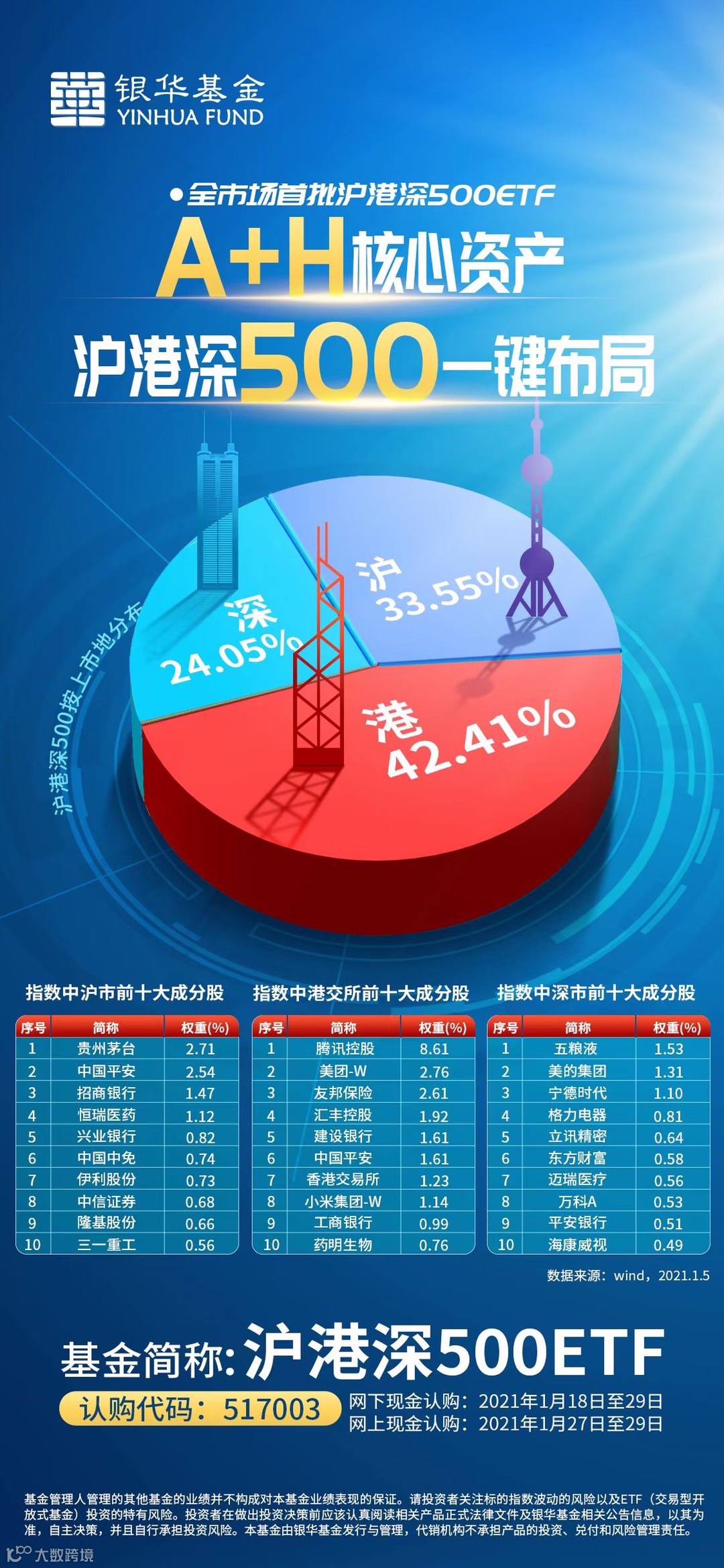 以2020年12月底的数据为例,中证沪港深500指数的成份股在上交所、深交所、港交所的权重分别为33.6%、24.0%、42.4%,成份股总市值为723708亿元,股息率2.07%,前三大行业占比为:金融地产32.3%、信息技术16.5%、可选消费12.2%,前十大重仓股包含腾讯控股、美团、贵州茅台、友邦保险、中国平安等,权重合计27.38%;中证500ETF指数的成份股总市值109186亿元,股息率1.14%,前三大行业为:工业23.5%、原材料18.6%、信息技术13.8%,前十大重仓股权重合计占比为7.38%。