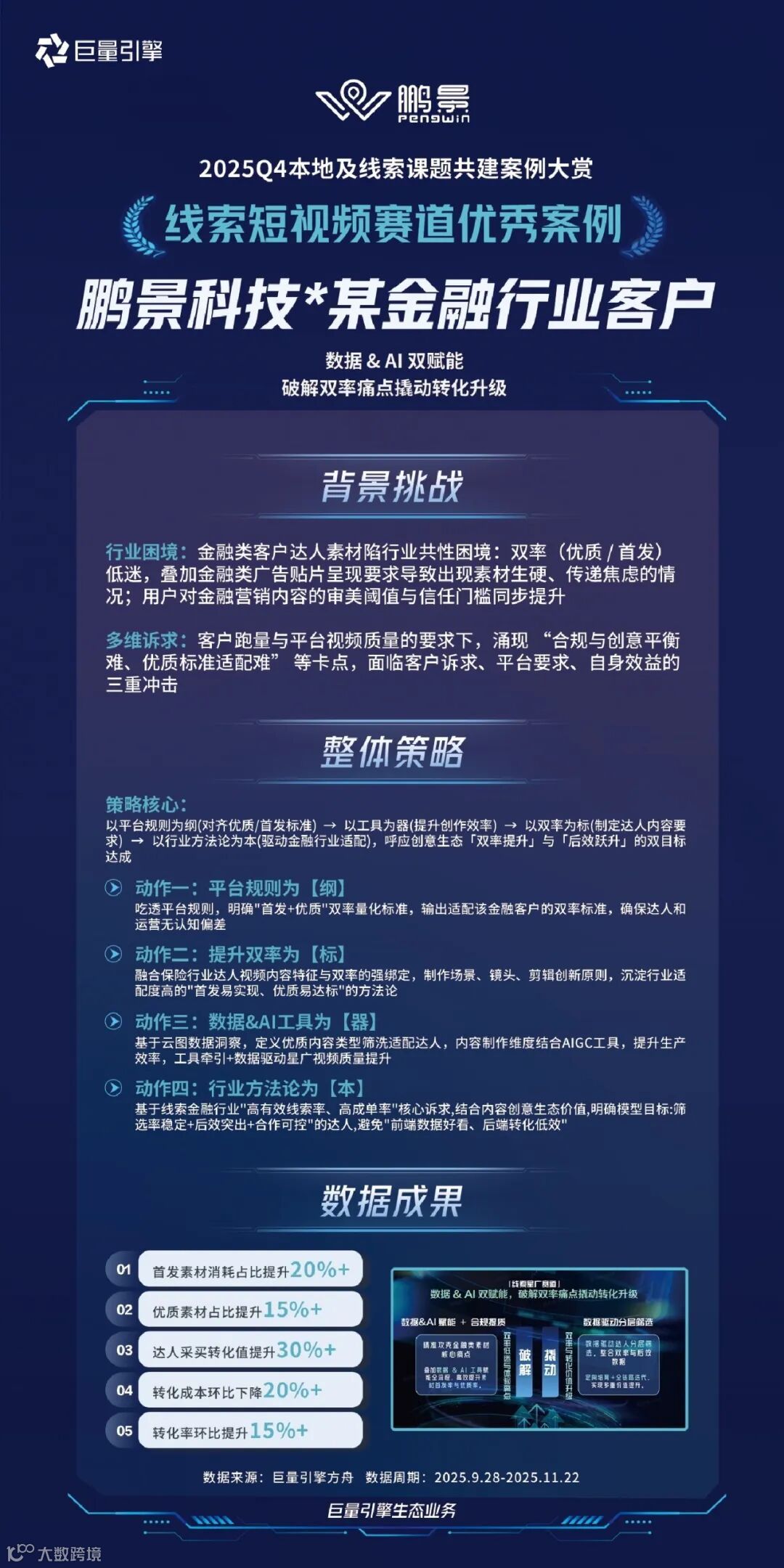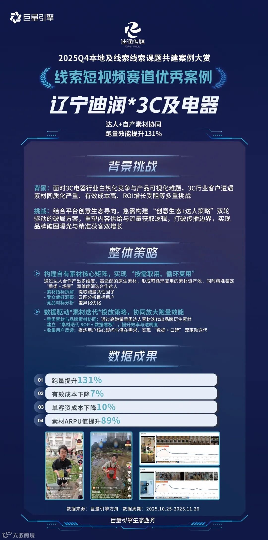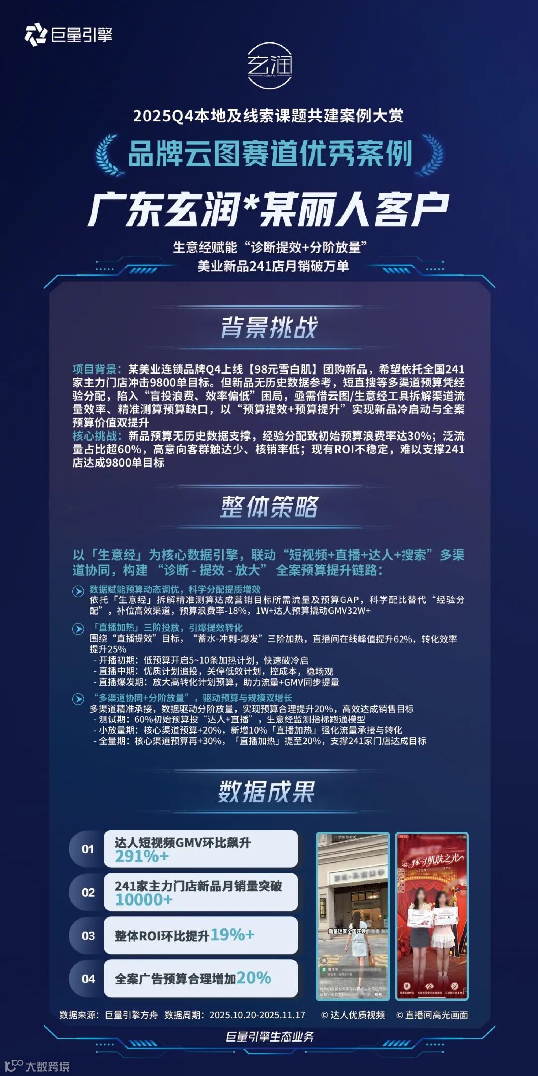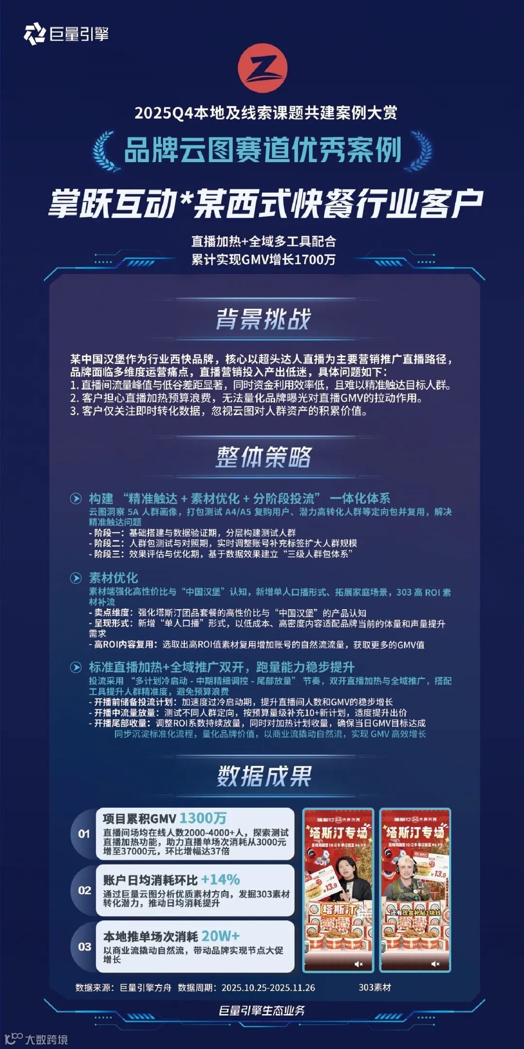 巨量引擎2025Q4本地&线索业务场景课题共建,根据年度策略导向设置了设置了「品牌云图场景」、「本地直播场景」「本地私信场景」「本地短视频场景」四大场景 & 五大课题,公开招募共91家代理&报名129则,最终遴选39家代理入围进行课题共建,本期共产出38则有效案例。为保障公平性原则,本次课题共建案例评选采用交叉评分,综合评估投放策略、产品应用、生意效果和行业方法,最终评选出积分榜top4 及15则优秀案例。