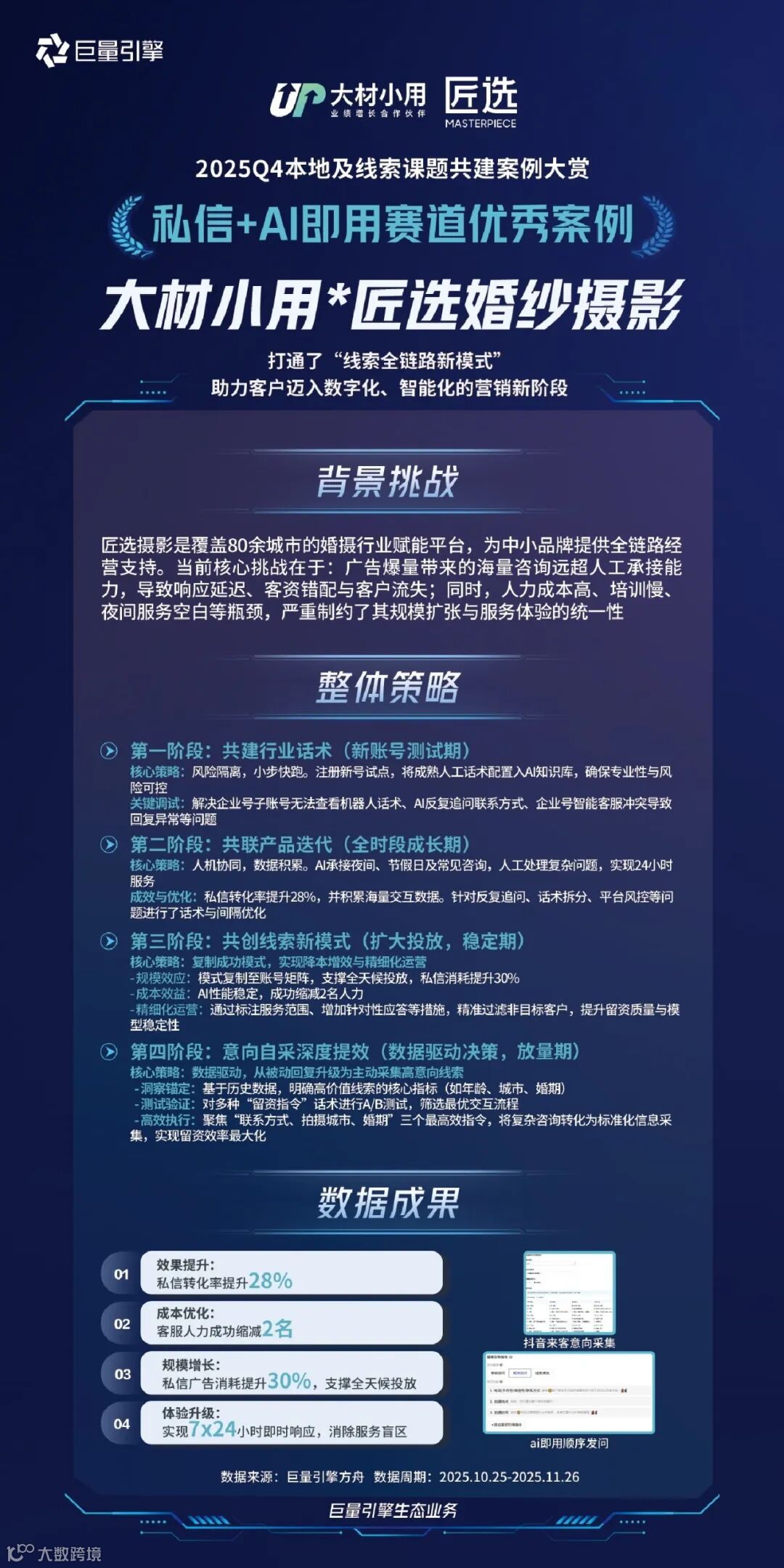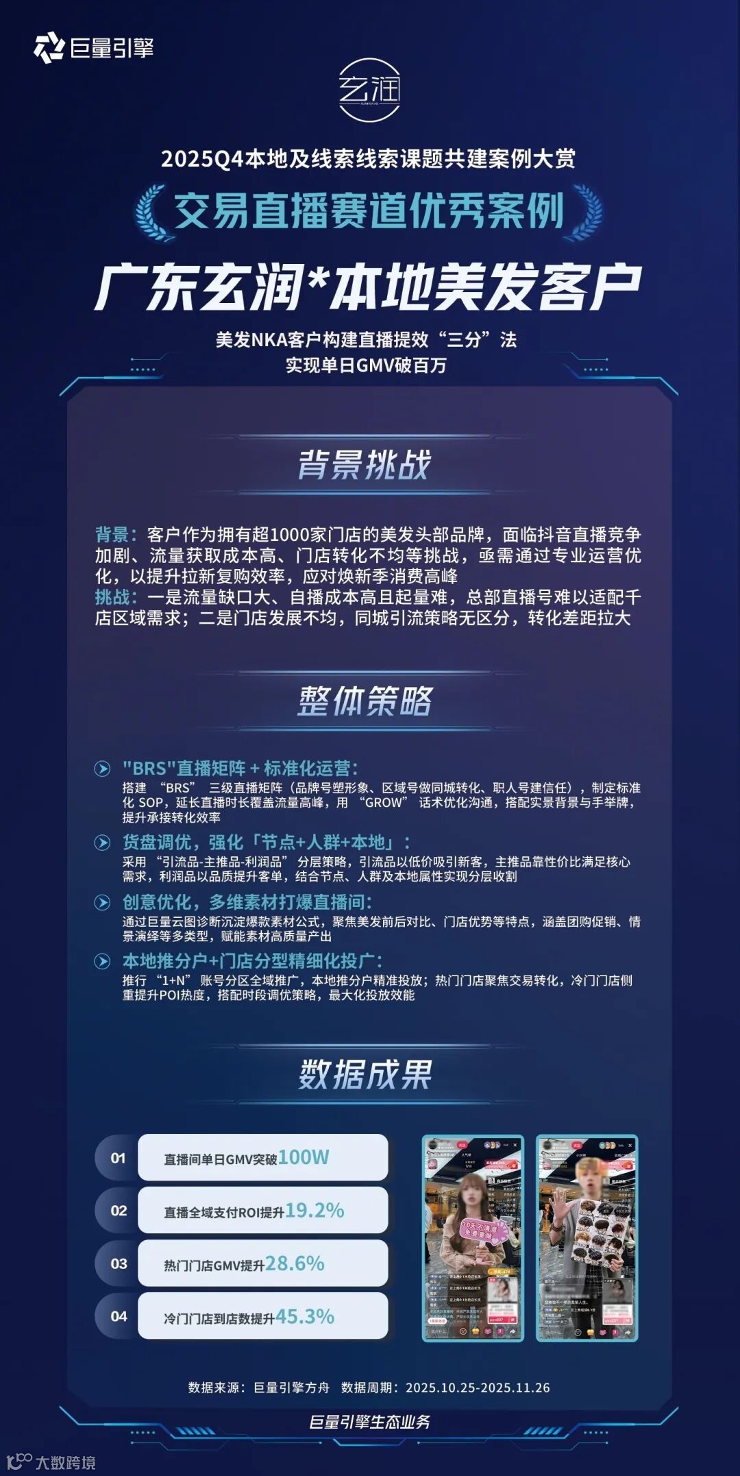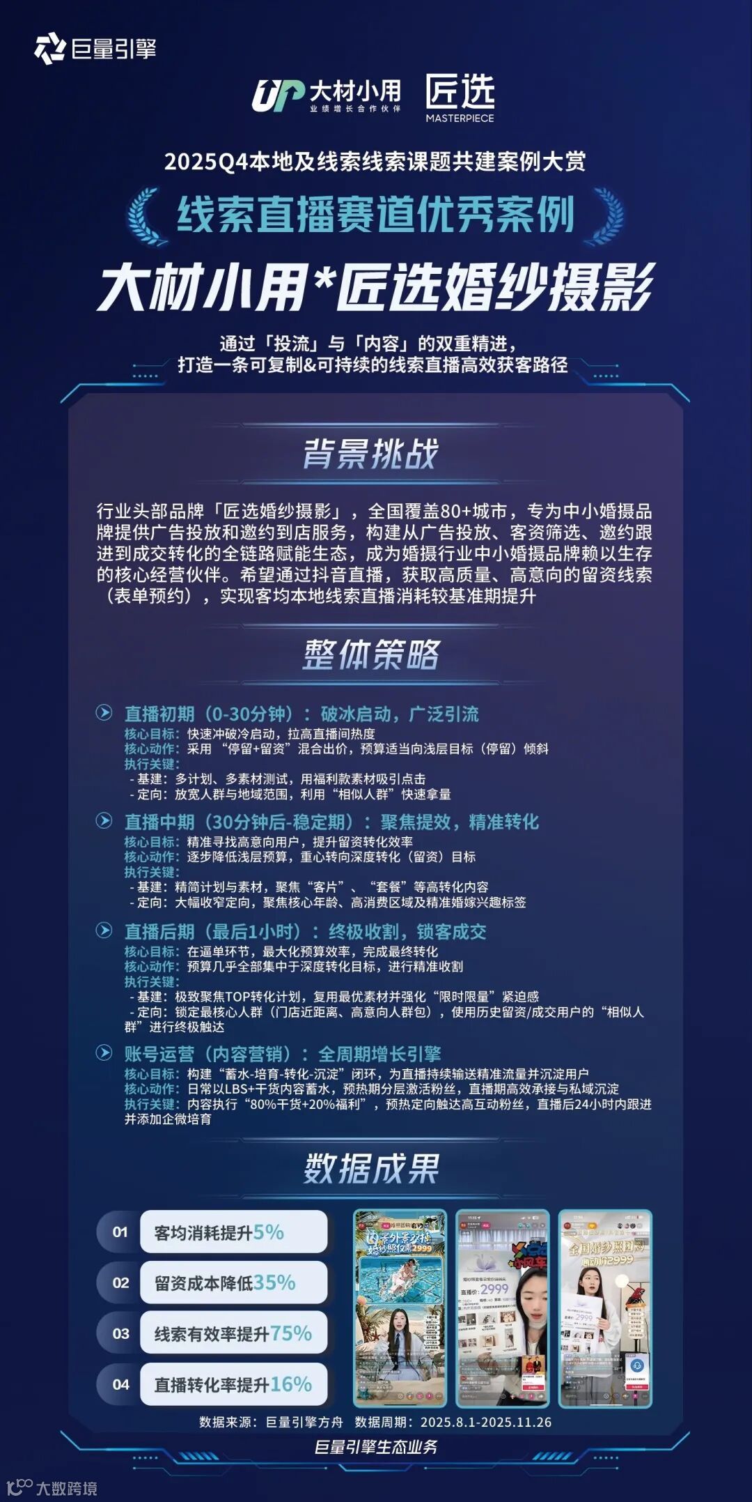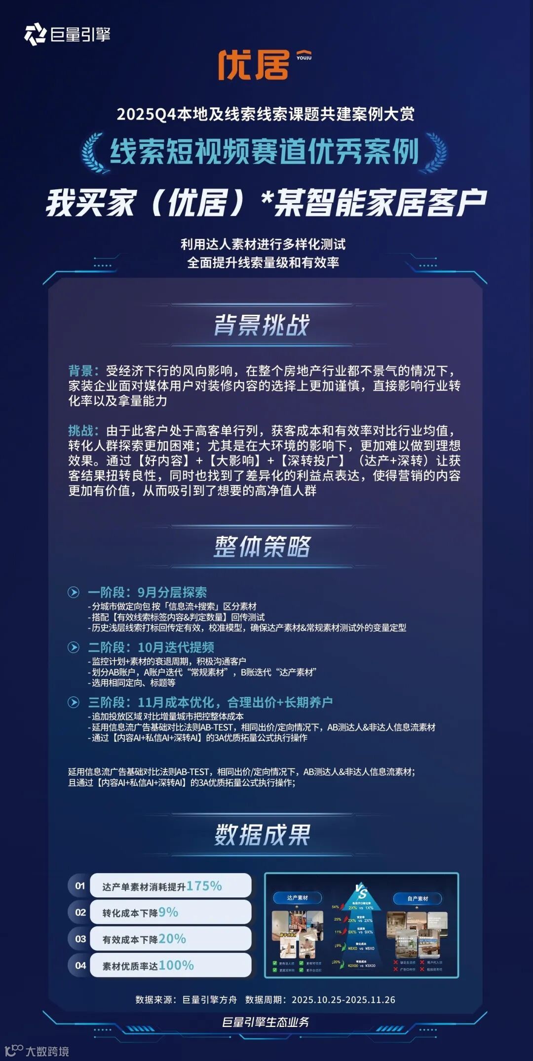 巨量引擎2025Q4本地&线索业务场景课题共建,根据年度策略导向设置了设置了「品牌云图场景」、「本地直播场景」「本地私信场景」「本地短视频场景」四大场景 & 五大课题,公开招募共91家代理&报名129则,最终遴选39家代理入围进行课题共建,本期共产出38则有效案例。为保障公平性原则,本次课题共建案例评选采用交叉评分,综合评估投放策略、产品应用、生意效果和行业方法,最终评选出积分榜top4 及15则优秀案例。