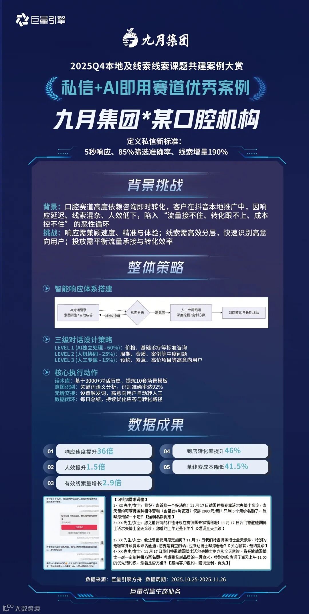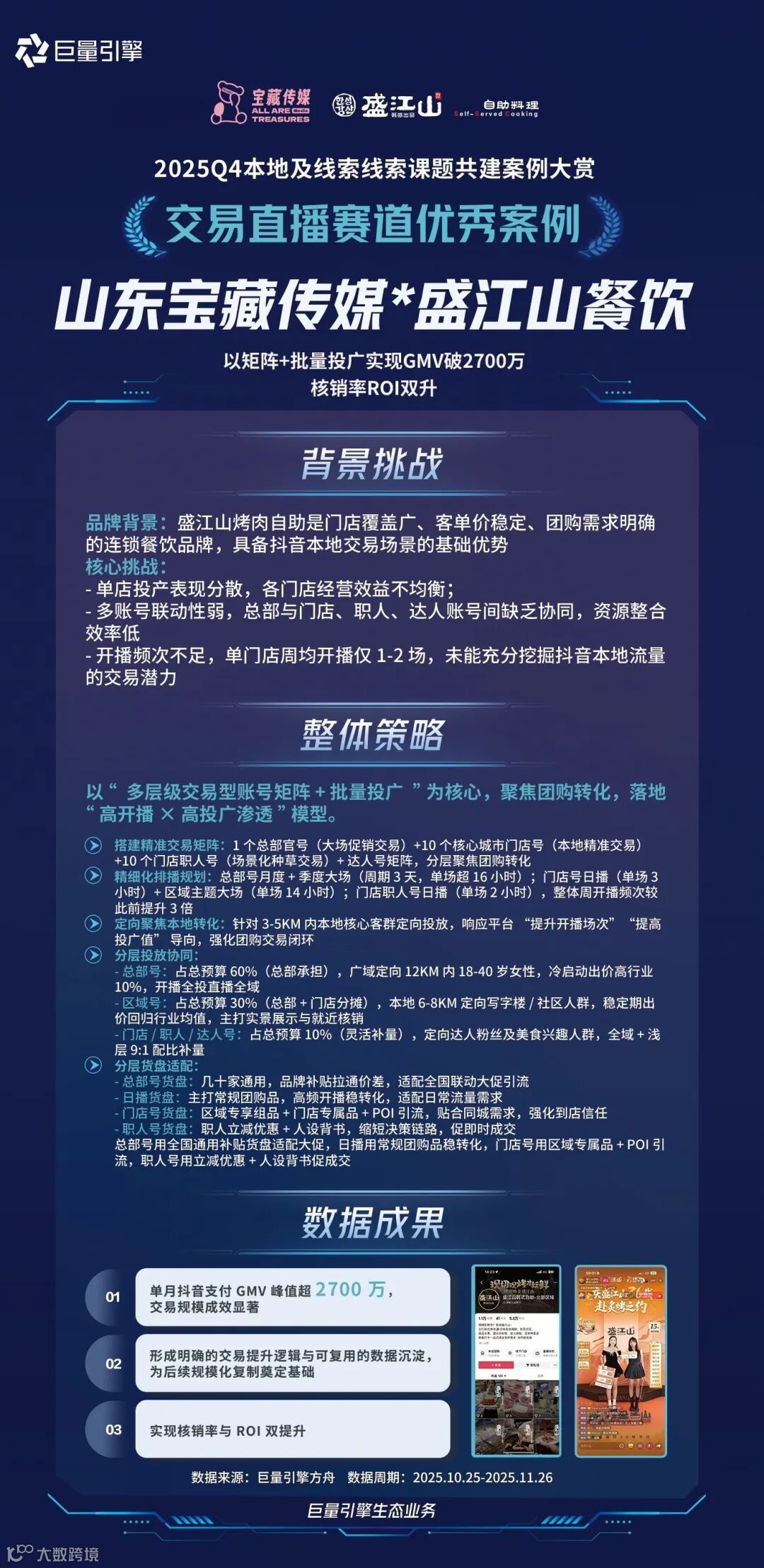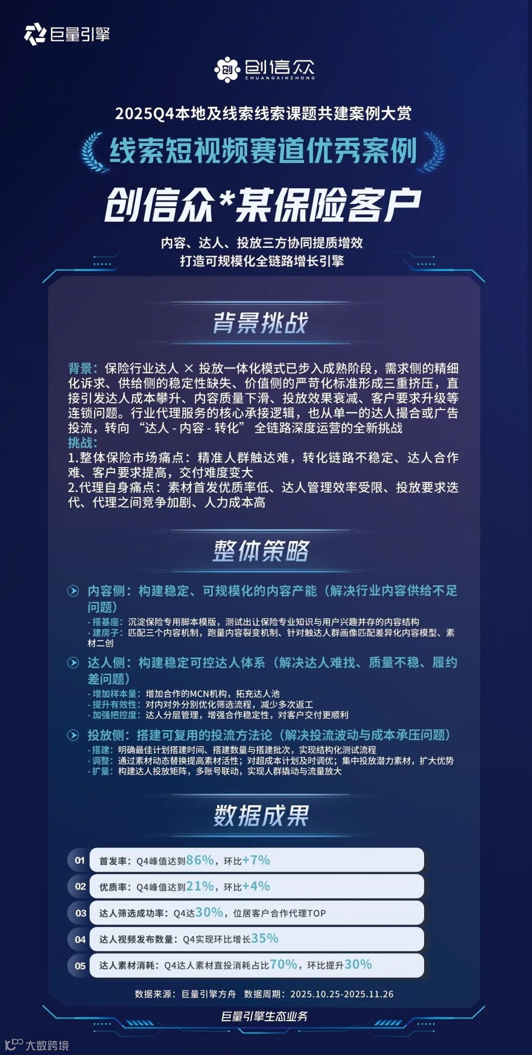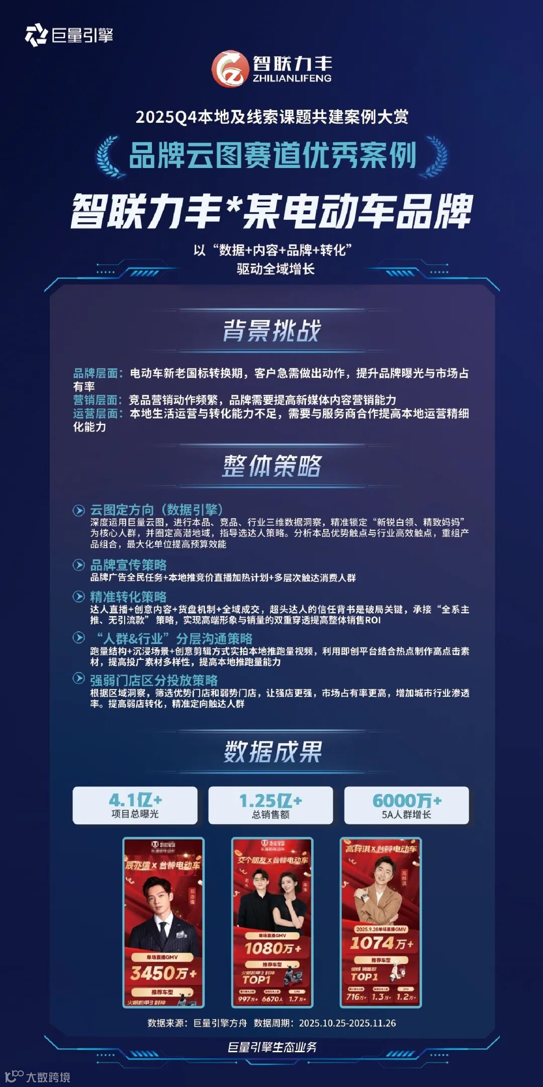 巨量引擎2025Q4本地&线索业务场景课题共建,根据年度策略导向设置了设置了「品牌云图场景」、「本地直播场景」「本地私信场景」「本地短视频场景」四大场景 & 五大课题,公开招募共91家代理&报名129则,最终遴选39家代理入围进行课题共建,本期共产出38则有效案例。为保障公平性原则,本次课题共建案例评选采用交叉评分,综合评估投放策略、产品应用、生意效果和行业方法,最终评选出积分榜top4 及15则优秀案例。