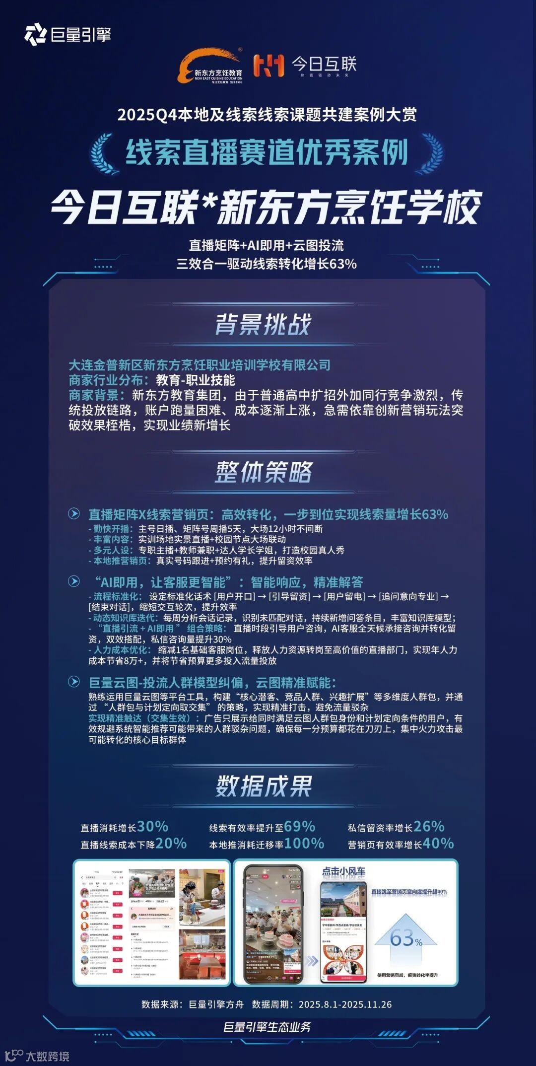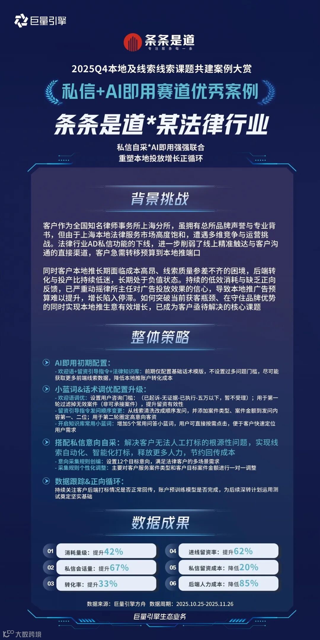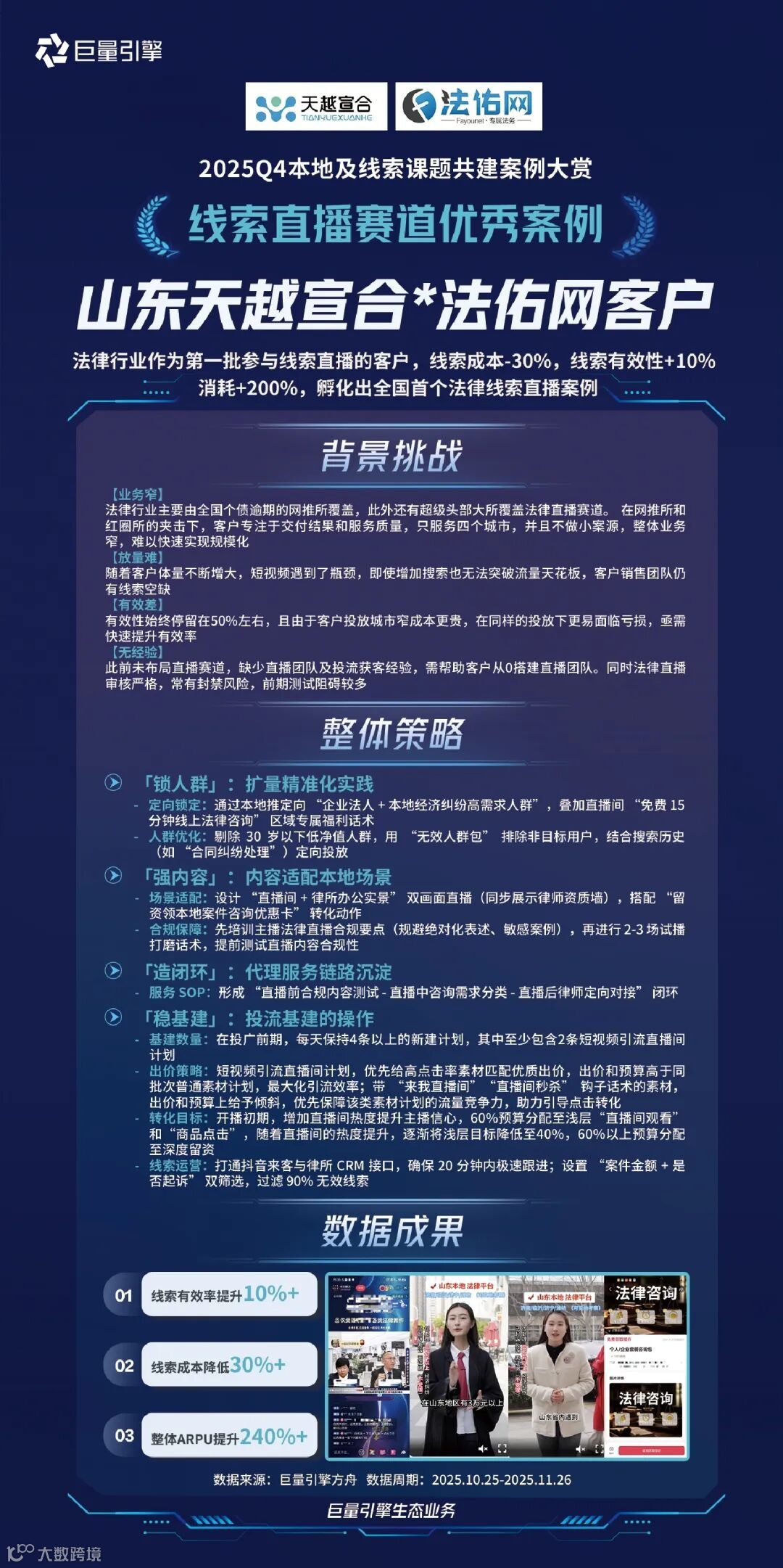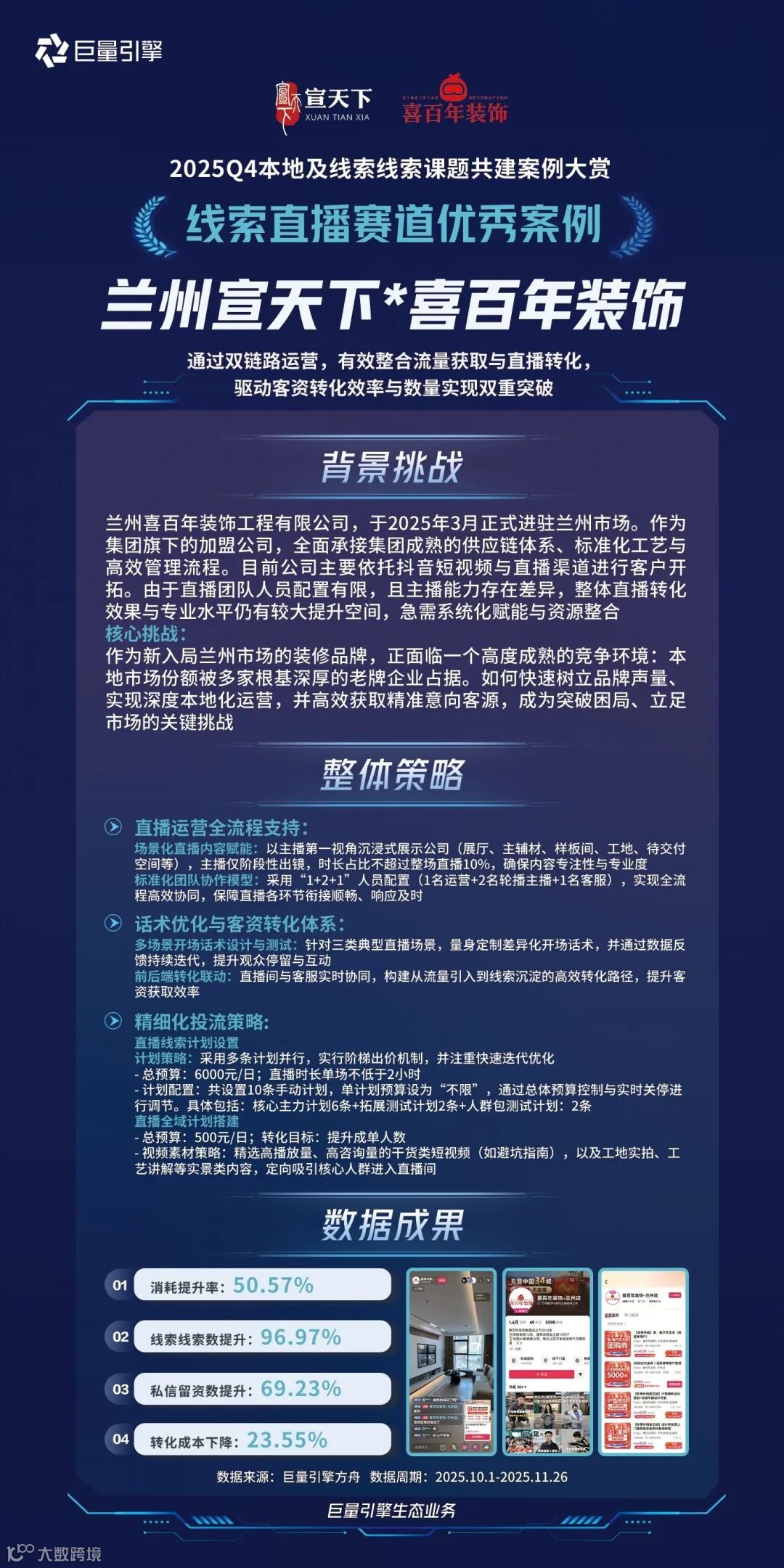 巨量引擎2025Q4本地&线索业务场景课题共建,根据年度策略导向设置了设置了「品牌云图场景」、「本地直播场景」「本地私信场景」「本地短视频场景」四大场景 & 五大课题,公开招募共91家代理&报名129则,最终遴选39家代理入围进行课题共建,本期共产出38则有效案例。为保障公平性原则,本次课题共建案例评选采用交叉评分,综合评估投放策略、产品应用、生意效果和行业方法,最终评选出积分榜top4 及15则优秀案例。