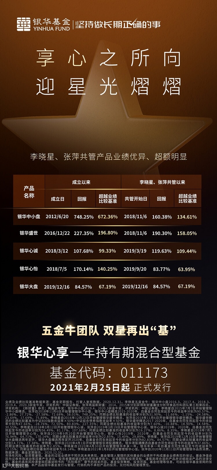 经受住市场检验后,李晓星团队延续这种成功的合作机制,在牛年初始推出的银华心享(011173),也被称为两人代表作——银华盛世精选的2.0版本。其中,理工科专业出身的李晓星,以成长投资闻名业内,自担任基金经理以来,每年都荣获金牛奖,备受机构认可,将主要负责银华心享的行业配置及科技领域投研工作。银华消费女神张萍,深耕大消费领域十余年,曾在2014、2015年连续获得新财富最佳分析师食品饮料团队第三名和第四名,将主要负责银华心享消费领域投研工作。