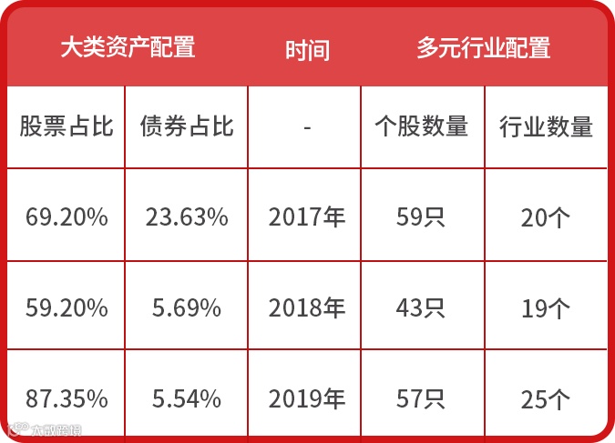 银华多元视野的平衡秘诀有两点,一是大类资产配置,主配股票、兼配债券,攻守结合;二是多元行业配置,分散风险。根据银华多元视野2017年-2019年年报显示,该基金持有个股均在50只左右,覆盖行业在20个左右。
