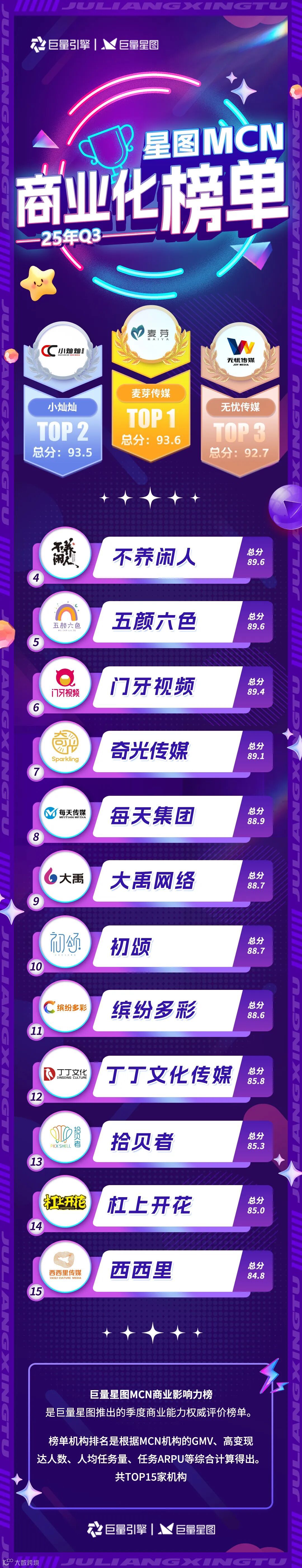 「2025年Q3季度巨量星图MCN机构榜单」今日正式发布!在过去一个季度,我们不仅发布了《MCN经营指南》,为机构精细化运营提供方向,还成功举办了CEO私享会,与行业同仁共探增长新机,在内容与商业加速融合的新阶段,我们基于多维度数据与专业评估,正式推出两份聚焦不同赛道的MCN实力榜单,助力行业把握风向、聚力突破。