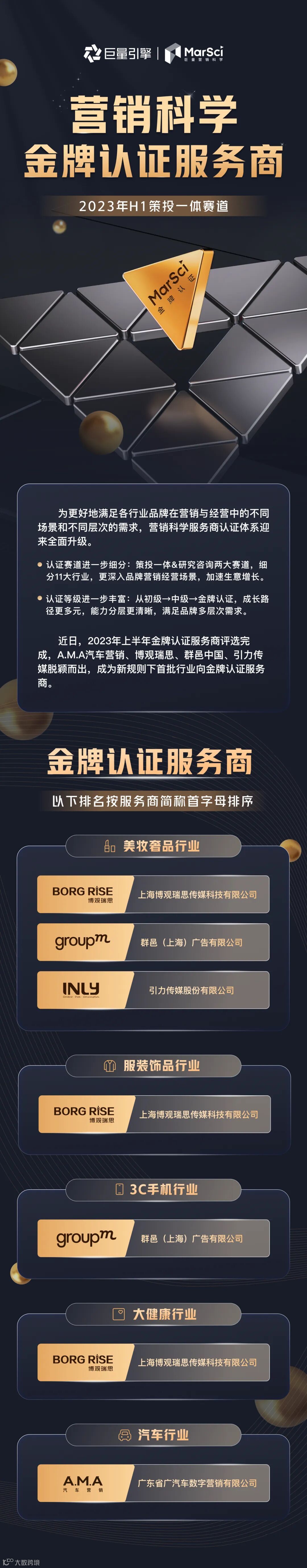·对于金牌认证,则在中级认证基础上进一步增加了“行业创新能力”的考核,金牌认证服务商不仅得是行业的专家,具备具体行业的深度理解洞察和经验,还需要能够与重点客户、平台共建,共同打造基于行业的经营方法论,驱动品类增长;具备行业营销科学实践应用标准引领能力,持续输出行业前沿创新的行业解决方案与实践,影响品牌客户高层决策。