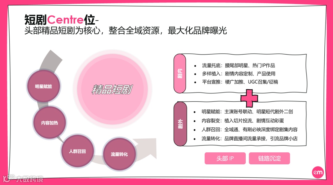 以头部精品短剧为内容起点,借势明星主演/改编IP等热度,剧外联动宣发,通过短剧出圈带动品牌破圈。