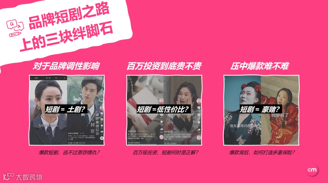 然而,面对爆款短剧中的爱恨情仇,品牌入局的脚步往往充满了迟疑。选得对不对,买得亏不亏,每一次品牌合作背后都有诸多现实考量。在品牌短剧营销之路上,往往会出现以下三块绊脚石: