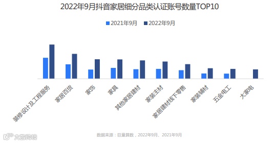当抖音逐渐成为用户消费的重要场域,各家居品牌也纷纷布局抖音,加速抢占流量阵地,构建品牌专属私域流量矩阵。巨量算数数据显示,截至2022年9月抖音家居类认证企业号同比去年增长80%,其中细分家居类别中,装修设计类及家居百货企业积极性最高,抢先进行阵地经营与私域布局。
