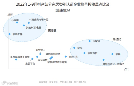 在细分类别中,大家电、家具、装修设计类别的企业账号持续保持较高内容输出,同时,小家电、家电配件、消费电子等类目账号借助产品场景化介绍等内容迅速扩充体量。接下来,家装主材&辅材、五金电工、家装平台类别的企业品牌需要同步提高内容创作量和内容质量,挖掘用户兴趣点,以进一步提升品牌内容和用户间的互动链接,增强线上内容竞争力。