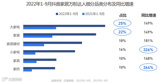 当前,大家电及家装品类达人占比分居第一、二位,但随着小家电、家纺等细分品类的不断发展,相关品类的创作达人数据增长迅猛。同时,抖音家居达人突破垂类主播桎梏,呈多元拓展态势,原剧情、教育等播主也开始尝试进入家居内容。