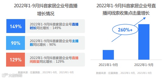 全民直播热情高涨,短视频+直播已成为品牌种草转化的重要方式,2022年1-9月,家居企业号直播时长同比增长149%。同时,对于家居企业的线上经营来说,线索收集也获得了不错的反馈。品牌直播间通过在直播间的线索收集插件,增强与用户沟通,强化线索经营,2022年抖音企业号直播间的线索收集量迅速增长,同比2021年同期增长260%,品牌自播通过与用户强沟通、强互动,逐渐打通“种草-转化”的链路。