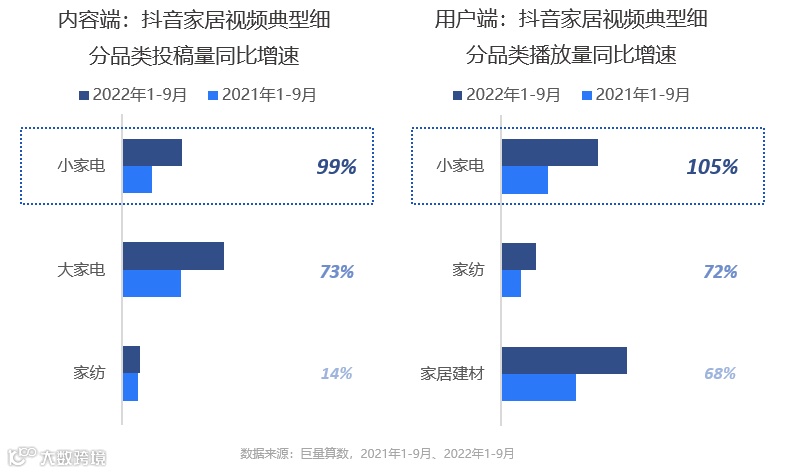 2022年,抖音的家居短视频在投稿量和播放量仍处于同步增长的趋势。受居家及健康生活理念提升的影响,小家电相关内容迎来“春天”,无论是投稿量还是播放量的同比增速均位列第一,成为2022年最受供需双方青睐的家居品类。