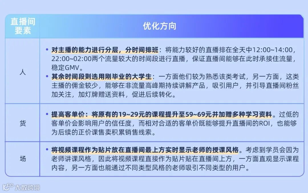 打造差异化直播间,凸显品牌特点:教育行业细分类目较多且参差不齐。一般教育类直播都用低价课来获取客资但有效性一般,会影响客户后期销售跟进的情况。适当提高客单价能够一定程度上解决这个问题。