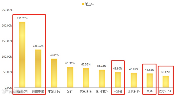 Wind数据显示,截至2019年9月18日,申万28个行业中近5年、近10年涨幅中的TOP10基本类似,都包含了食品饮料、家用电器、医药生物、计算机、休闲服务、非银金融、农林牧渔、银行等8个行业。