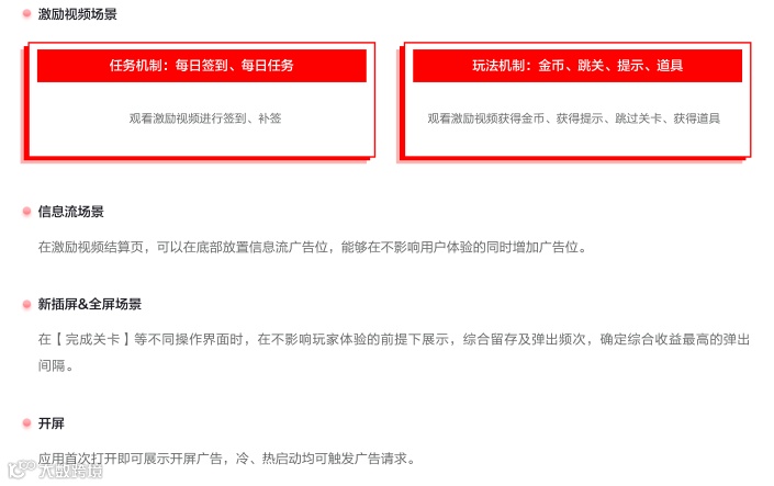 广告样式及场景:以激励视频为主,占比60%-70%。同时,答题解谜样式呈现多样化,信息流、全屏视频也有较高占比,在合适场景添加开屏、Banner广告能够高效提升广告库存。