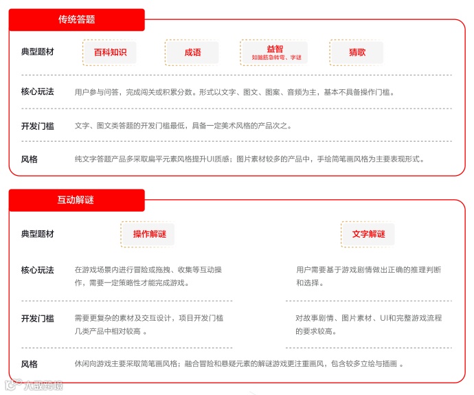 玩法扫描:传统答题品类玩法偏轻度,多采取纯文字、简单图文形式;互动解谜品类存在向中度玩法发展的空间。
