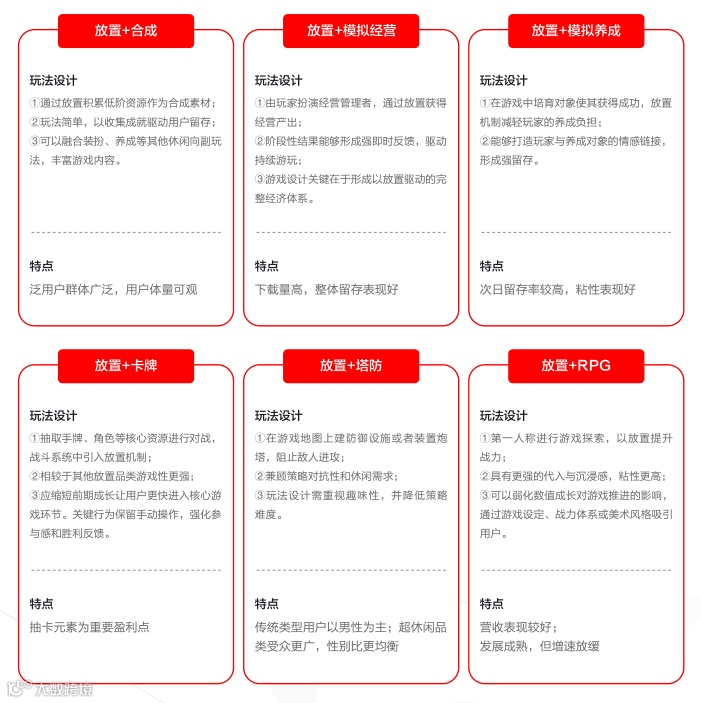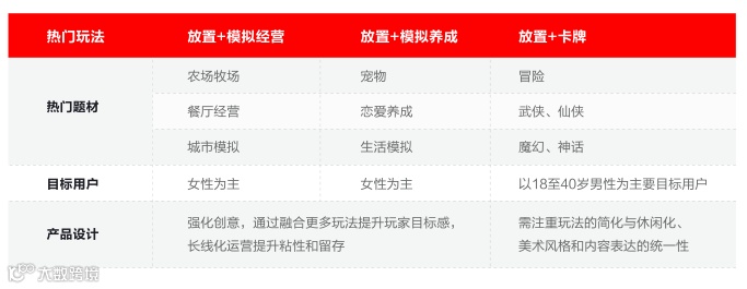 玩法扫描:放置游戏可融合的玩法众多,产品设计的共同要点是在核心玩法基础上将放置机制有效融合,降低游戏难度吸引泛游戏群体,并实现玩家减负。