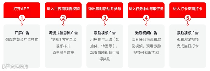 短视频平台的广告变现方式以激励视频为主,其次为沉浸式信息流广告。如何在不影响用户体验的情况下最大化获取广告收益,实现广告收益与用户活跃度的正向循环是变现设计的核心。