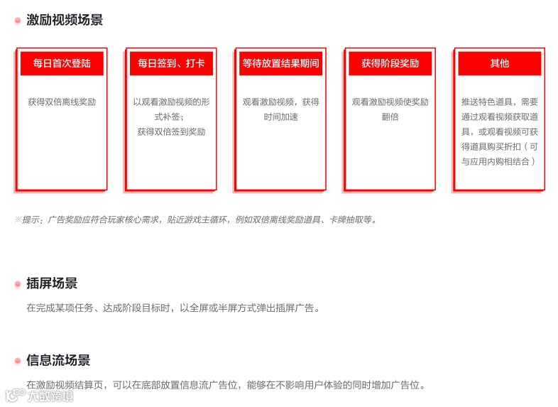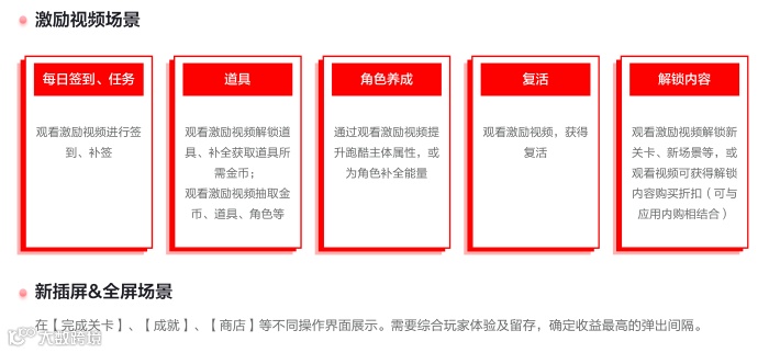 广告样式&场景:激励视频占比约为50%;其次为全屏视频,贴合过关结束等场景弹出;另外插屏、信息流样式也较为常用。