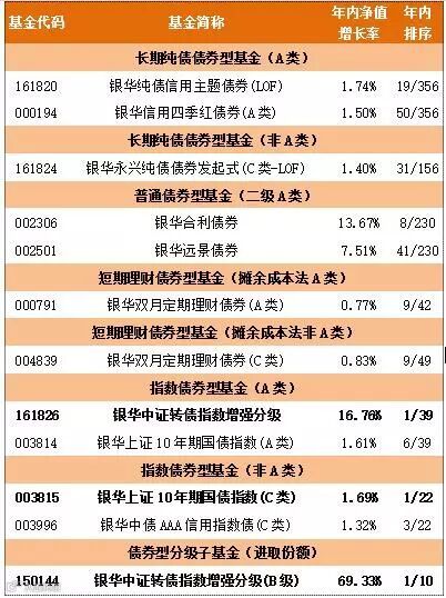 债券型基金主要投资债券资产。银华基金拥有一支固收旗舰团队,通过对宏观经济的深入研究和品种的切换,获取超额收益。2019年,银华旗下债基依然表现稳健,其中银华中证转债指数增强分级、银华上证10年期国债指数C在同类中排名第一。