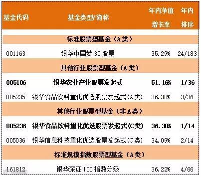银华农业产业基金重点投资于农业产业中具有长期稳定成长性的上市公司,搭乘2019年猪周期的东风业绩起舞,超过50%的年内回报,在所有股票型基金中的排名都很靠前,在36只其他行业股票型基金(A类)中排名第1。