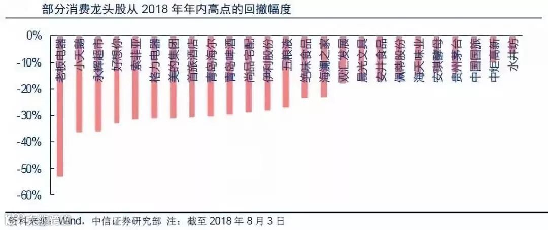 股指走到现在这个位置,市场关注的是未来还有多少下跌空间、强势股补跌到底会到什么程度。以投资者较为关注的强势股代表——消费龙头为例,今年以来,A股消费龙头从高点回撤的平均跌幅为23.7%,部分龙头跌幅甚至已经超过35%,回撤已经比较充分。
